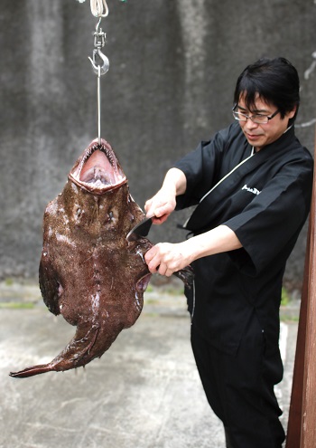 ヌルヌルとしていて柔らかいあんこうは、まな板ではさばきにくいため、この方法が考案されました。あごを金具で引っ掛けて吊るし、口から水を入れてからさばいていく昔ながらの手法です。