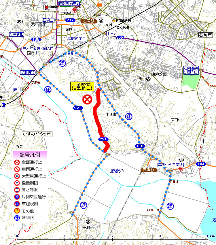 | 場所 | 石岡市中津川〜石岡市茨城3丁目 | 迂回路 | 飯岡石岡線BP、石岡田伏土浦線 | ||