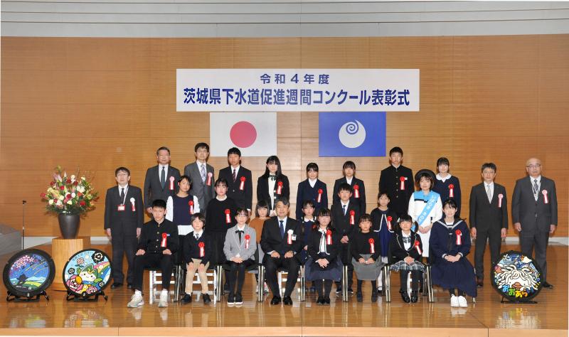 令和5年1月31日(火曜日)、茨城県庁9階講堂で令和4年度「茨城県下水道促進週間コンクール」表彰式を開催しました。本年度は32,907点の応募作品の中から知事賞に選ばれた21作品(22名)に表彰を行いました。