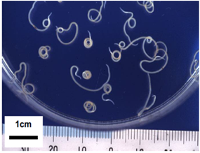 | スケトウダラの肝臓に寄生するアニサキスの幼虫 (リング状のもの) |