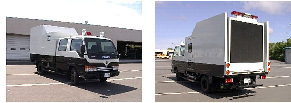 後部に大型表示板を装備した車両です。表示板は、1メートル上昇します。