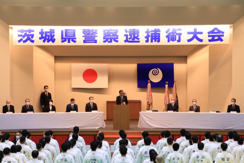 全委員が、茨城県武道館でにおいて開催された逮捕術大会に出席しました。寺門委員長が公安委員会を代表し、挨拶を述べました。 |