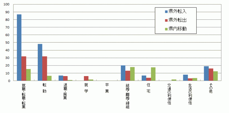 県外転出で最も多い理由は「就職・転職・転業」,「転勤」