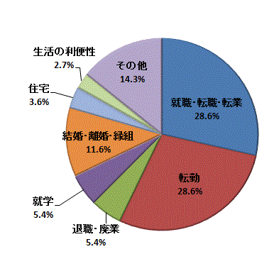 原因者について理由別にみると,「就職・転職・転業」及び「転勤」がそれぞれ28.6%,「結婚・離婚・縁組」が11.6%,「退職・廃業」及び「就学」それぞれが5.4%,「住宅(新築・購入・借り換え)」が3.6%などとなっている。(表6,図42)