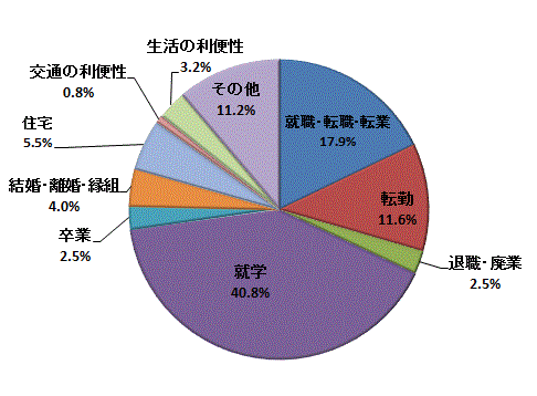 原因者について理由別にみると,「就学」が40.8%,「就職・転職・転業」が17.9%,「転勤」が11.6%,「住宅(新築・購入・借り換え)」が5.5%,「結婚・離婚・縁組」が4.0%,「生活の利便性」が3.2%,「退職・廃業」及び「卒業」が2.5%などとなっている。(表7,図49)