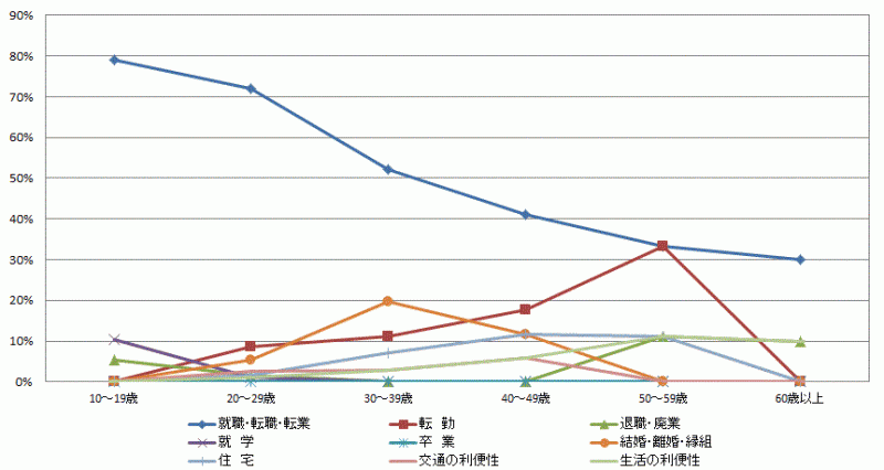 最も高い移動理由割合をみると,10歳から49歳,60歳以上の各年齢階級では「就職・転職・転業」で,「10~19歳」は78.9%,「20~29歳」は71.9%,「30~39歳」は52.1%,「40~49歳」は41.2%,60歳以上は30.0%となっている。