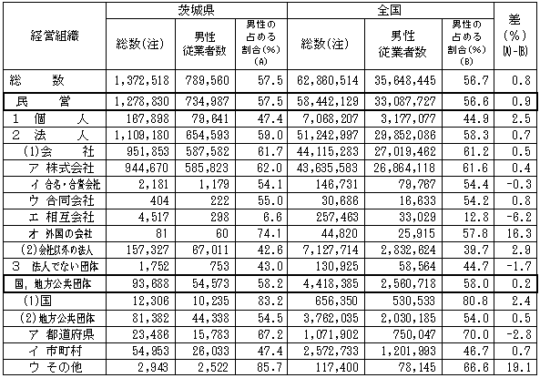 全国は「雇用者」が50,740,679人(従業者全体の87.4%),「有給役員」が4,188,122人(同7.2%),「個人業主・無給の家事従業者」が3,135,733人(同5.4%)となっている。