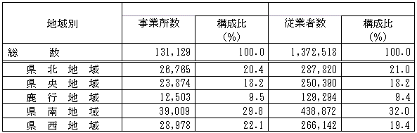 平成21年7月1日現在の県内の事業所数(事業内容等が不詳の事業所を除く。)は131,129事業所(全国の2.2%,第13位),従業者数は1,372,518人(全国の2.2%,第12位)となっている。(第1-1表)