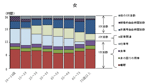 生活時間を年齢階級別にみると,1次活動時間は,男女ともに45~54歳が最も短く(男性9時間46分,女性10時間3分),75歳以上が最も長くなっている(男性12時間5分,女性12時間18分)。