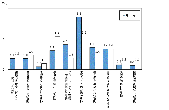 「ボランティア活動」の種類別に男女別の行動者率をみると、男性は「まちづくりのための活動」が8.6%と最も高く、次いで「スポーツ・文化・芸術・学術に関係した活動」(4.1%)、「安全な生活のための活動」(3.6%)などとなっている。女性についても「まちづくりのための活動」が5.5%と最も高く、次いで「子供を対象とした活動」(5.4%)、「自然や環境を守るための活動」(3.4%)などとなっている。(図-10)