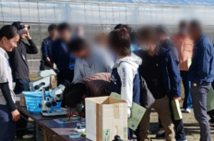 JAなめがたしおさい青果物生産部会では、ピーマン栽培における単収向上を目的に炭酸ガス施用技術の導入が進んでいます。今年は、1月から5月までに計4回、炭酸ガス施用技術導入ほ場において、当技術の普及推進とさらなる技術向上を目指して講習会を開催し、延べ80人が参加しました。