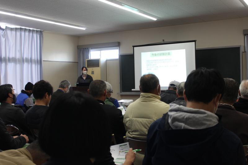 当所からは、儲かる農業実現に向けて取り組んできたこれまでの研究成果の紹介や、産地の各生産団体と一体となって取り組んできた現地検討会の様子を紹介しました。また、産地情勢についても説明するとともに、現在の試験研究課題の概要や進捗状況についても説明を行いました。
