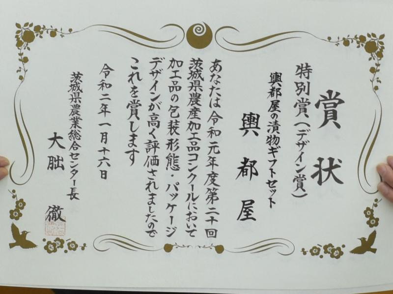 1月16日,県農業総合センターにおいて令和元年度農産加工品コンクールが開催され,筑西市の輿都屋(よつや)が出品した「輿都屋の漬物ギフトセット」がデザイン・アイデア賞を,下妻市の倉持ピッグファウム株式会社豚職人工房ぶぅ~ぶ~が出品した「ハム屋さんのソーセージセット」がテイスト賞をそれぞれ受賞しました。