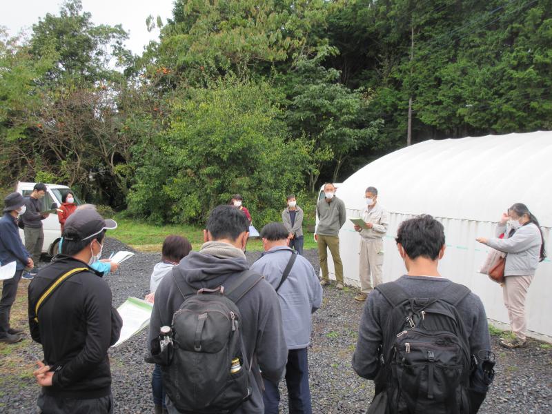 1カ所目の研修先である石岡市の朝日里山ファームでは、NPO法人アグリやさと代表の柴山氏に、新規就農者の支援状況について、説明してもらいました。その後、現在研修中の方の話を聞いたり、ほ場の見学をしました。