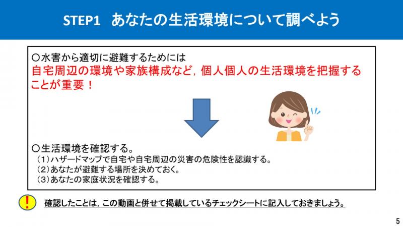 災害から身を守るためには、適切に避難することが重要で、災害時の個人の防災行動計画(スケジュール表)であるマイ・タイムラインを事前に作っておくと、いざというときの避難に役立ちます。