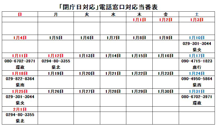0294-80-3355 | 日立市、常陸太田市、高萩市、北茨城市、 常陸大宮市、大子町 |