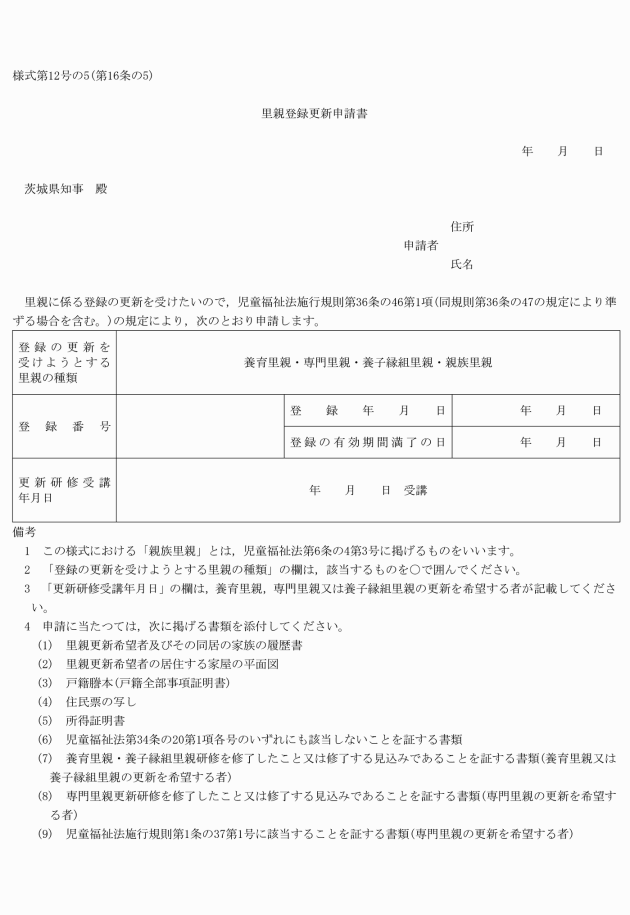 第16条の5 規則第36条の46第1項の規定による登録の更新の申請(規則第36条の47の規定により準じて行うこととされているものを含む。)及び規則第36条の46第3項の規定による登録の更新の申請は,里親登録更新申請書(様式第12号の5)を居住地を管轄する児童相談所長を経由して知事に提出して行わなければならない。