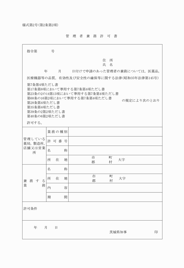 第2条 法第7条第4項ただし書(法第17条第8項,法第23条の2の14第13項及び法第68条の16第2項において準用する場合を含む。),法第28条第4項ただし書,法第35条第4項ただし書,法第39条の2第2項ただし書又は法第40条の6第2項ただし書の規定による許可(以下この条において「管理者兼務許可」という。)を受けようとする者は,管理者兼務許可申請書(様式第1号)により知事に申請しなければならない。