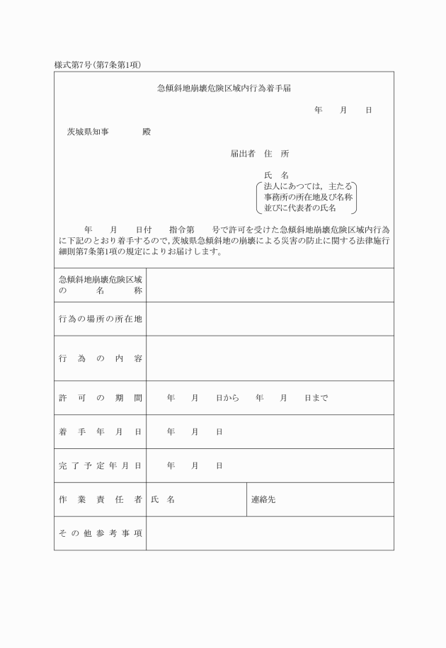 第7条 許可を受けた者は,当該許可に係る行為に着手しようとするときは,着手の7日前までに急傾斜地崩壊危険区域内行為着手届(様式第7号)を知事に提出しなければならない。
