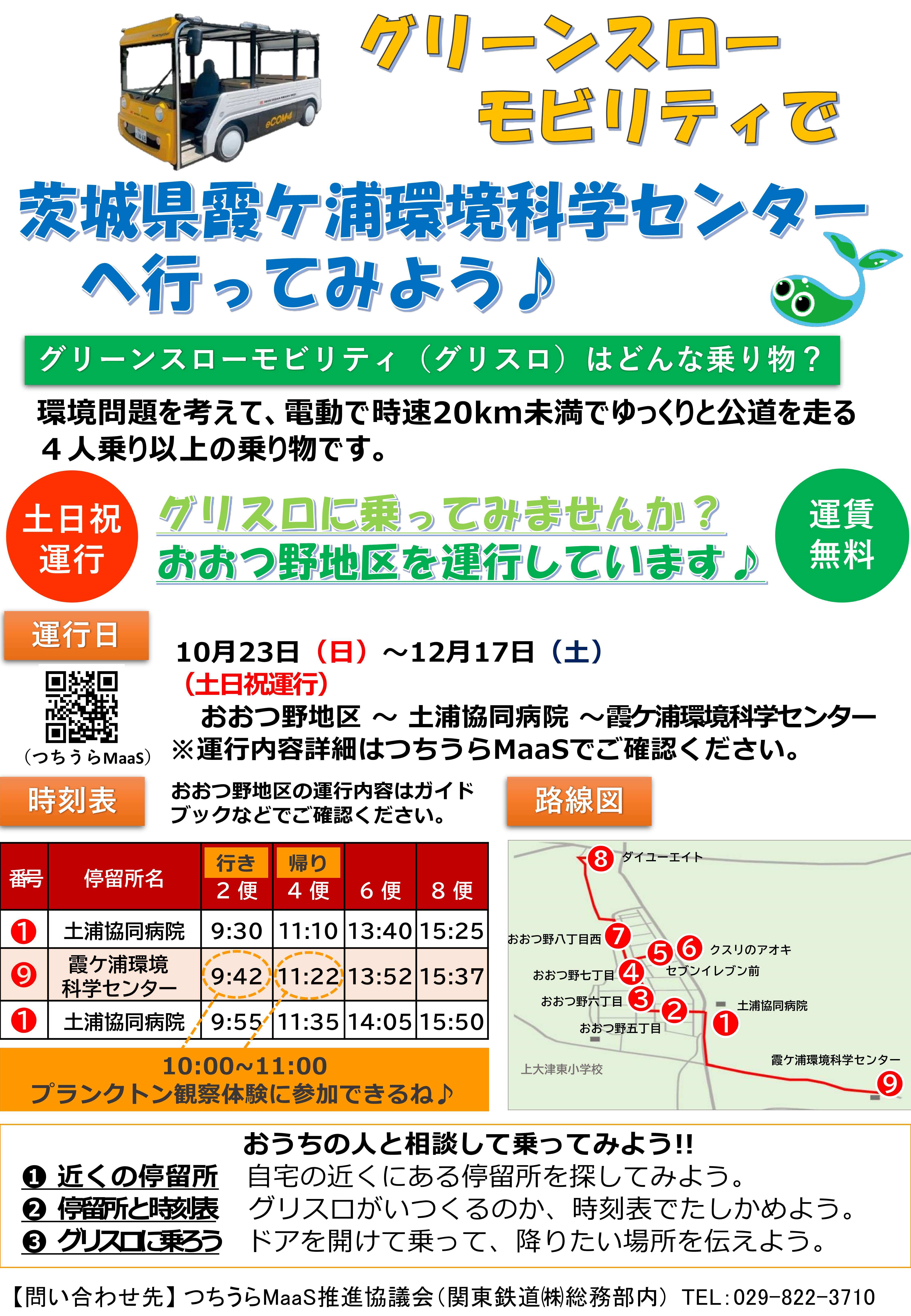 ※土浦市内(おおつ野地区・沖宿町地区)で実施される実証実験に合わせ、土日祝日のみ土浦協働病院〜霞ケ浦環境科学センター間でも運行されます。