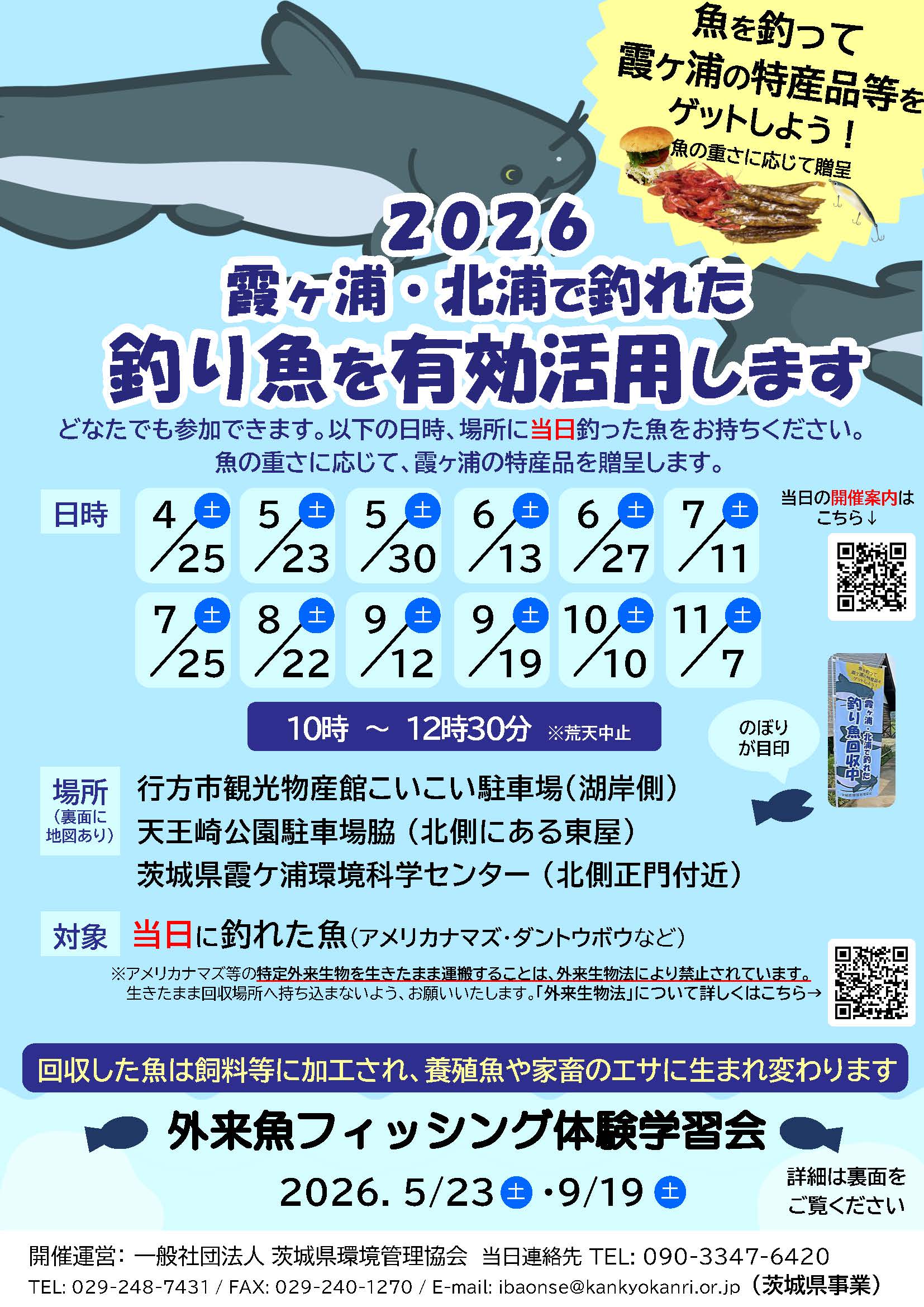 - 下記の日程にて、霞ヶ浦で釣れた魚の回収を行いますので、ご協力いただける方は、回収場所への持ち込みをお願いいたします。