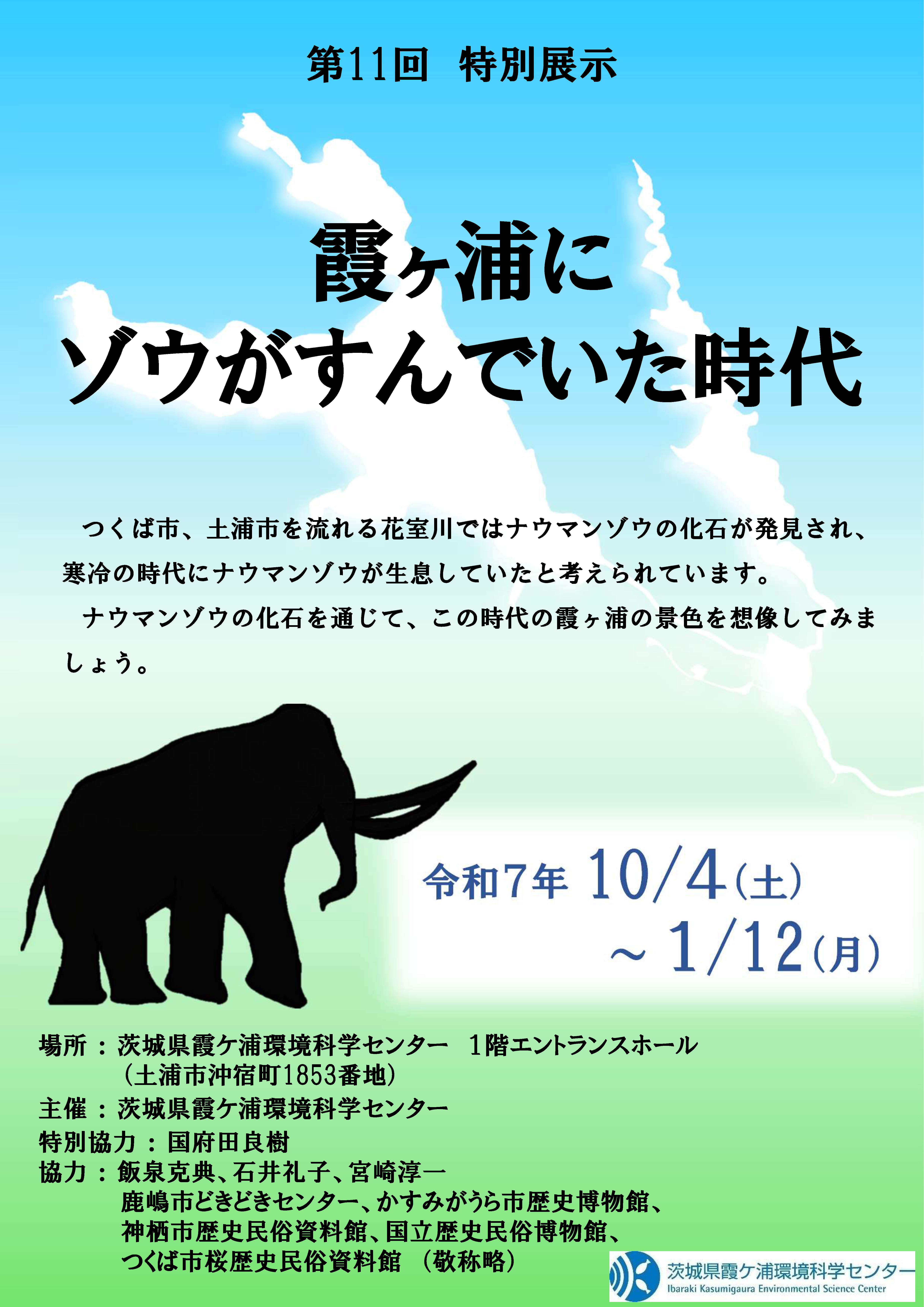 茨城県では、霞ヶ浦周辺を中心に多くのナウマンゾウ化石が産出し、つくば市、土浦市を流れる花室川では、最終氷期の4〜3万年前の地層からナウマンゾウの化石が発見され、寒冷の時代に適応して生息していたと考えられます。
