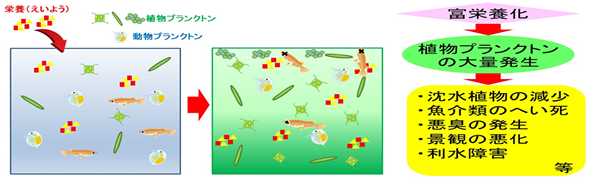 湖沼に植物プランクトンの栄養源が必要以上に増えてしまうことを富栄養化といいます。